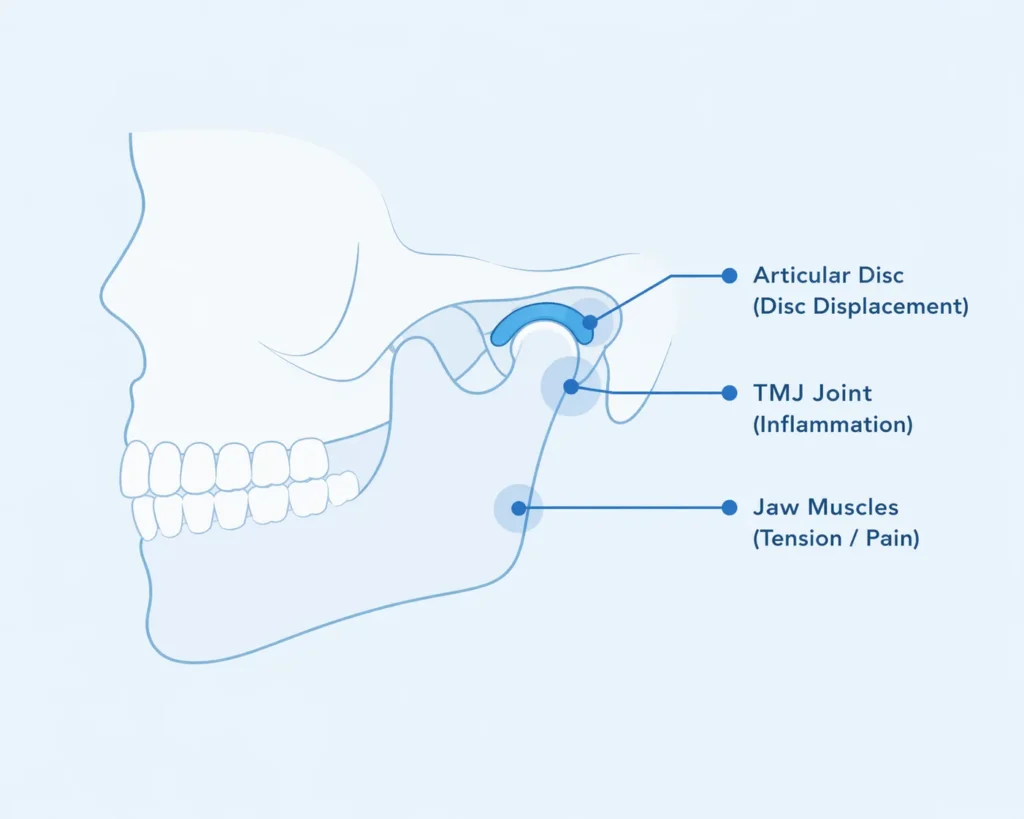 TMJ dysfunction can cause a wide range of symptoms. While jaw pain is the most obvious sign, many people experience problems in nearby areas such as the temples, ears, or neck.